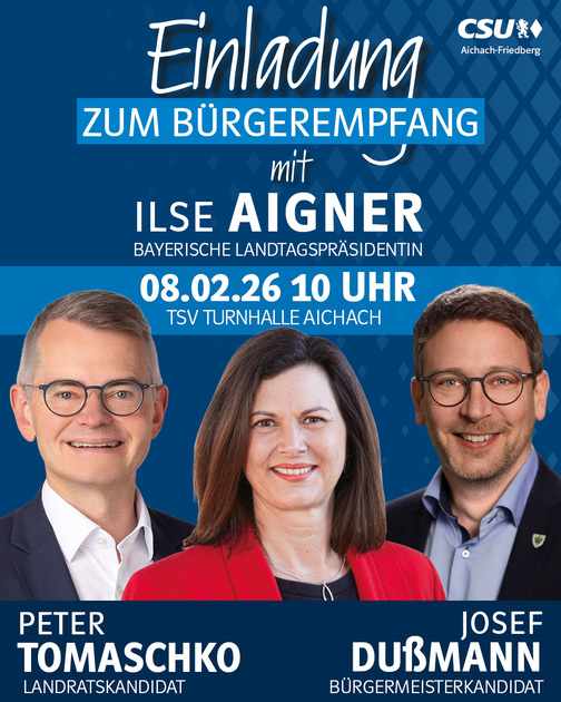 Auf Einladung des Landtagsabgeordneten und Landratskandidaten Peter Tomaschko und des Aichacher Bürgermeisterkandidaten Josef Dußmann wird die Präsidentin des Bayerischen Landtags, Ilse Aigner, am Sonntag, den 08. Februar 2026 nach Aichach kommen. Gemeinsam mit allen CSU-Ortsverbänden aus dem Aichacher Stadtgebiet laden Peter Tomaschko und Josef Dußmann alle Einwohner zum großen Bürgerempfang in die TSV-Turnhalle in Aichach ein. Beginnen wird die Veranstaltung um 10 Uhr. ... weiterlesen