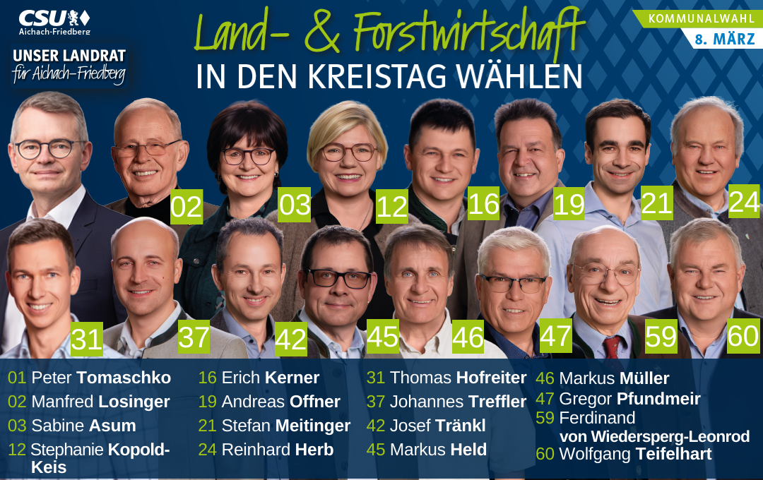 Im Vorfeld der Kommunalwahl am 8. März hat Landratskandidat Peter Tomaschko, gemeinsam mit seinem Team der CSU-Kreistagsliste, auf zahlreichen Veranstaltungen im Wittelsbacher Land sein starkes Zukunftsprogramm mit vielen konkreten Ideen vorgestellt. Die Themen decken alle zentralen Bereiche der Landkreispolitik ab und zeigen, wie er den Landkreis Aichach-Friedberg in den nächsten Jahren fit für die Zukunft machen will. ... weiterlesen