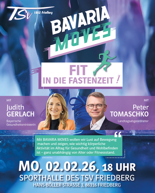 Bewegung, Gesundheit und gemeinsames Aktivsein stehen im Mittelpunkt der Veranstaltung „Bavaria Moves – Fit in die Fastenzeit“, zu der der Landtagsabgeordnete Peter Tomaschko gemeinsam mit dem TSV Friedberg einlädt. Die Veranstaltung findet am Montag, 2. Februar 2026, um 18 Uhr in der Sporthalle des TSV Friedberg (Hans-Böller-Straße 3, 86316 Friedberg) statt. ... weiterlesen