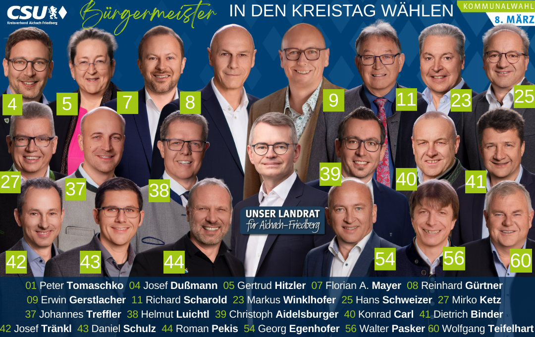 Die CSU Aichach-Friedberg setzt im Kreistag bewusst auf Menschen, die täglich Verantwortung in den Städten und Gemeinden tragen. „Wer vor Ort Verantwortung trägt, weiß am besten, wo der Schuh drückt und wie man Probleme pragmatisch lösen kann. Genau dieses Praxiswissen brauchen wir auch im Kreistag“, betont der Landtagsabgeordnete und Landratskandidat Peter Tomaschko. ... weiterlesen