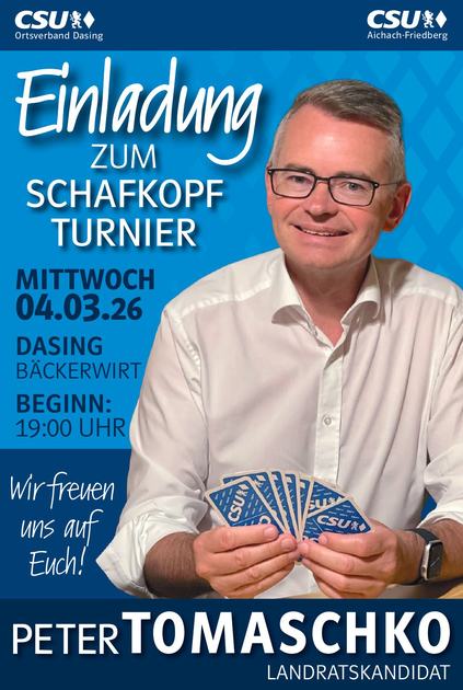 Der Landtagsabgeordnete und Landratskandidat Peter Tomaschko wird gemeinsam mit dem CSU-Ortsverband Dasing eine alte bayerische Tradition pflegen und ein Schafkopfturnier beim Bäckerwirt in Dasing veranstalten. Hierzu laden Tomaschko und die CSU Dasing alle interessierten Bürgerinnen und Bürger herzlich ein. ... weiterlesen